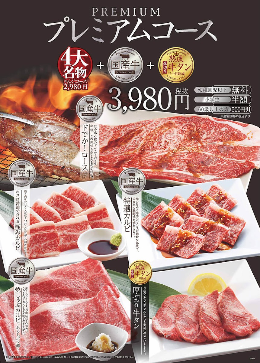 Introducing the menu at Yakiniku King - Nagoya is a delightful culinary experience centered around the concept of all-you-can-eat yakiniku. Located in the heart of Nagoya, this establishment offers a popular "King Course" that allows guests to savor up to 58 items, including premium beef, pork, chicken, seafood, and a variety of vegetables and desserts. The diverse offerings ensure something for every palate, with special attention to seasonal and limited-time items that keep frequent diners coming back for more.